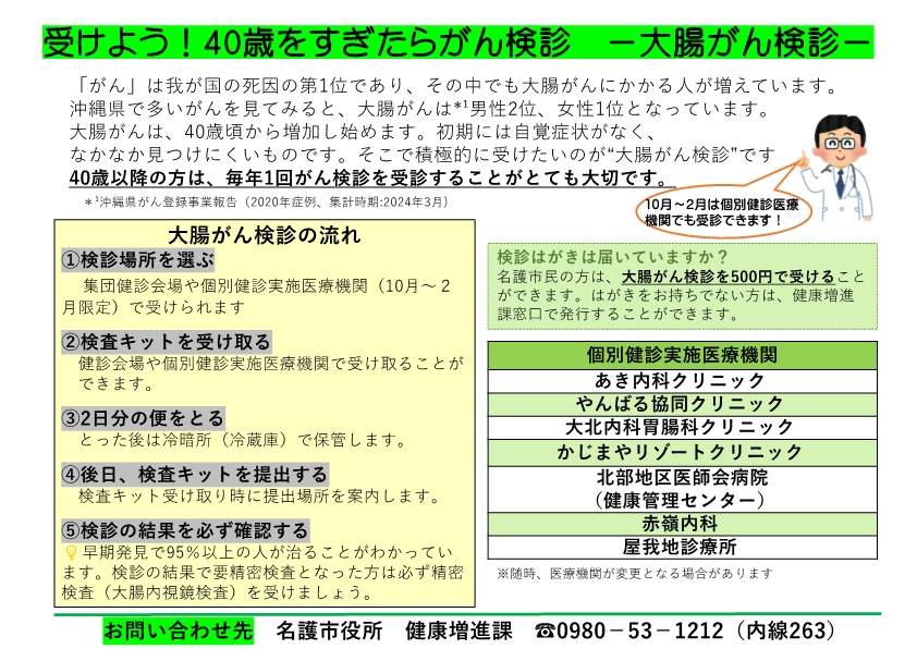 大腸がん検診が個別医療機関でも受けられます。