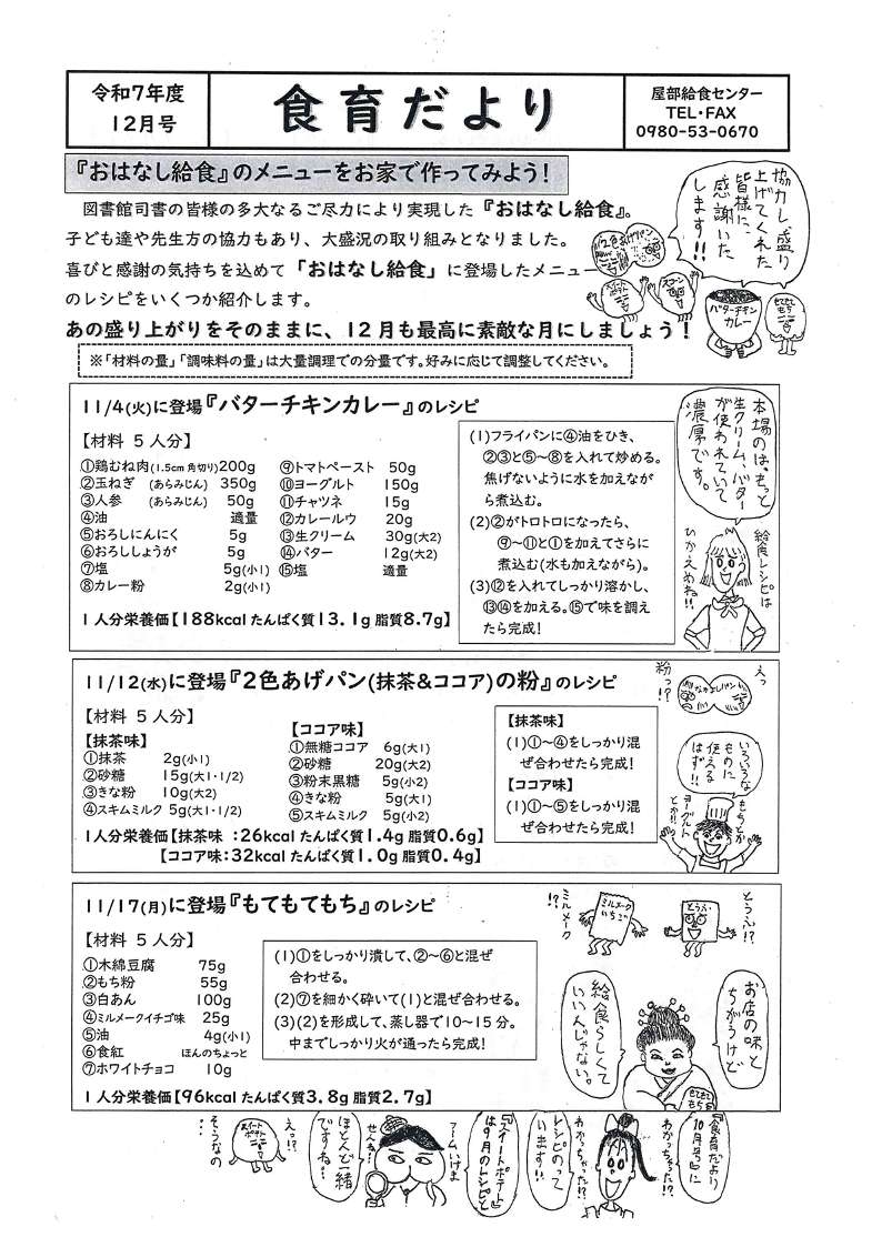 電話:0980-53-1212 (学校給食係 内線130・121)